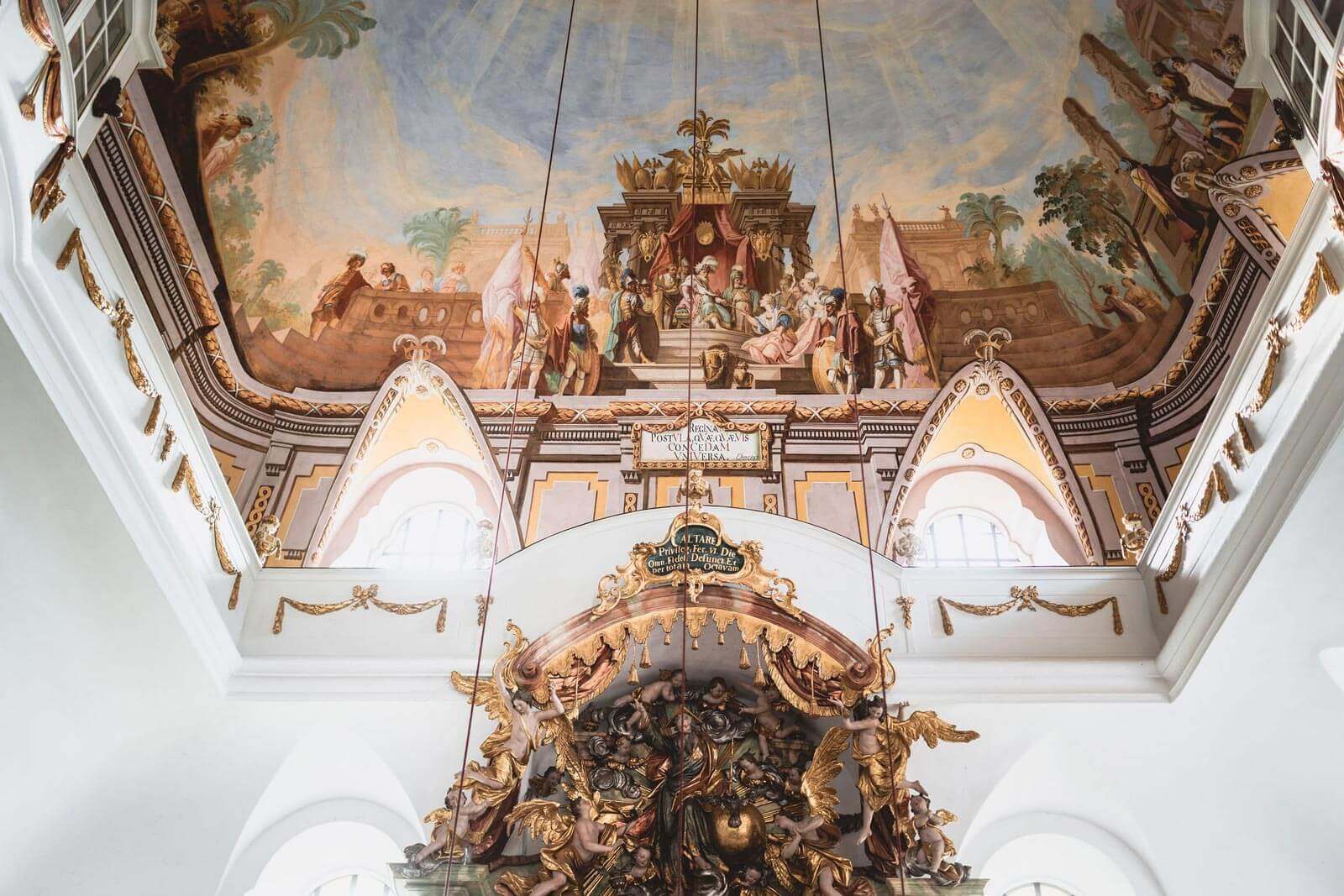Das Deckengemälde von Johann Nepomuk della Croce, 1783, stellt die Geschichte der Königin Esther dar. Der Hochaltar, um 1760 von dem Passauer Joseph Deutschmann geschaffen, wurde 1782-84 im Zuge der Kapellenrenovierung von dem Landshuter Christian Jorhan d.Ä. weitgehend erneuert. Die Fassung ist von dem Erdinger Franz Xaver Zellner. In der Mitte des Hochaltars ist eine frühe Kopie des als „Deutsches Gnadenbild“ bekannten Werkes von Lukas Cranach d.Ä. zu sehen.