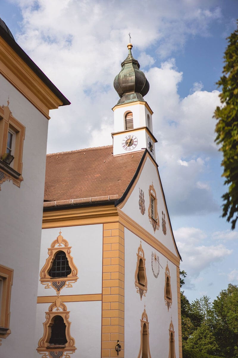 Heute nimmt die Schlosskirche fast ein Drittel des Gebäudes ein und sticht bei der Einfahrt mit ihrem Kuppelgiebelreiter und den Geigenkastenfenstern als erstes ins Auge.
