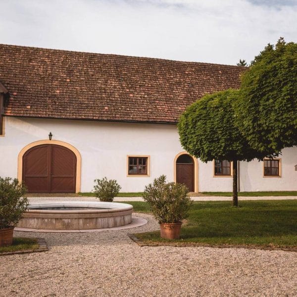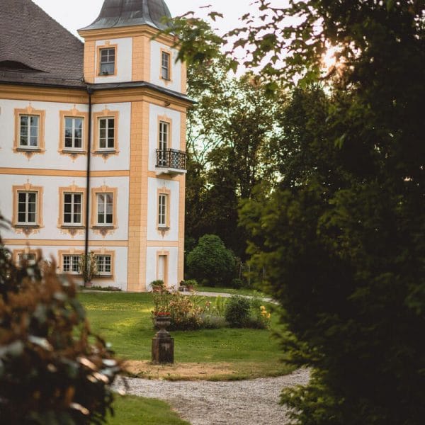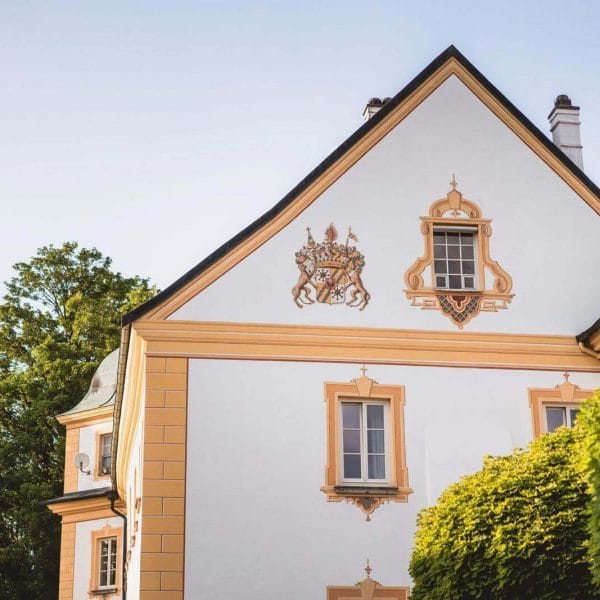 Der barocke Edelsitz aus dem Ende des 17. Jahrhunderts ist ein dreiflügeliger, zweigeschossiger Bau mit zwei über Eck gestellten Türmen an der Nordseite mit flachen Kuppelhauben. Ein dritter, hofseitiger Turm, wurde im 20. Jh. ergänzt. Die Ostseite nimmt die Schlosskirche auf. Die Fassade zieren gemalte Simsbänder und Fensterrahmungen mit Spätrokoko- und Zopfmotiven. Der ca. 4 Hektar große Park zieht sich stark abfallend bis nach Postmünster hinunter und bietet so eine prachtvolle Aussicht über das Rottal.