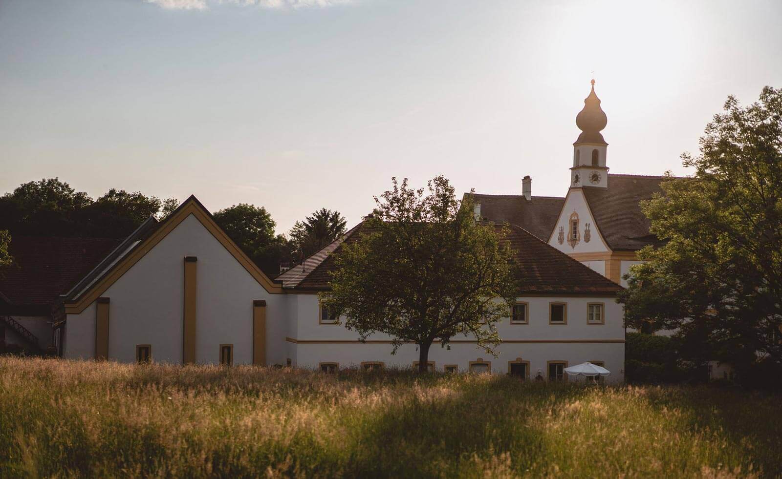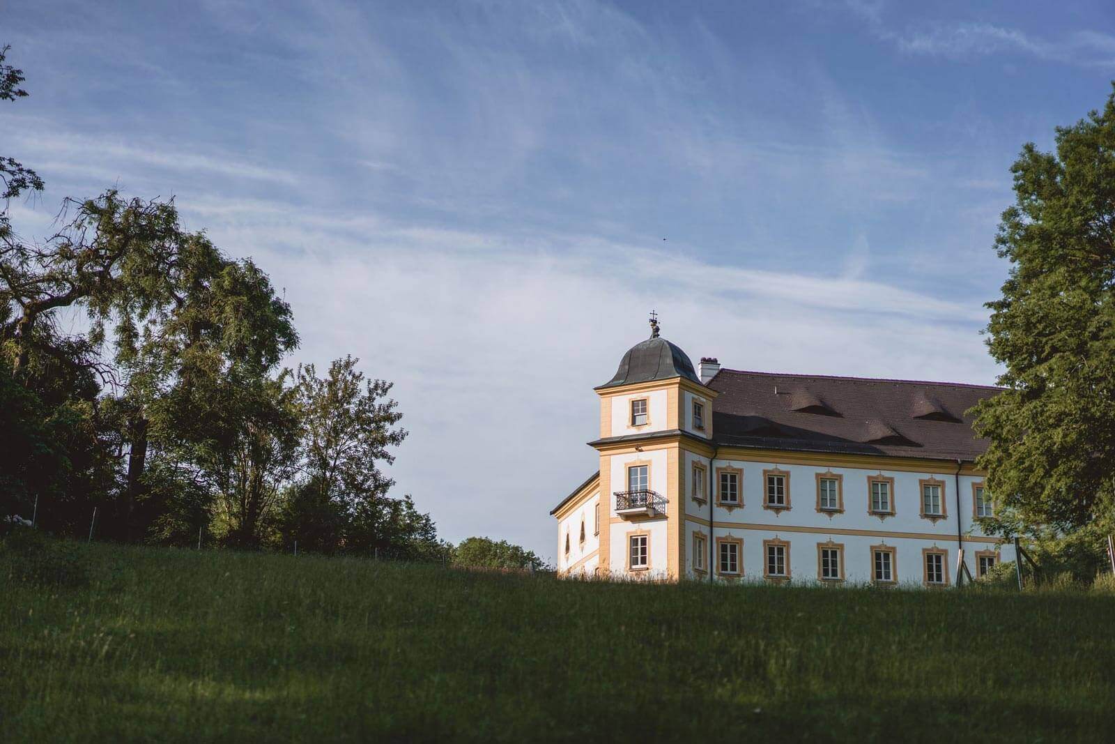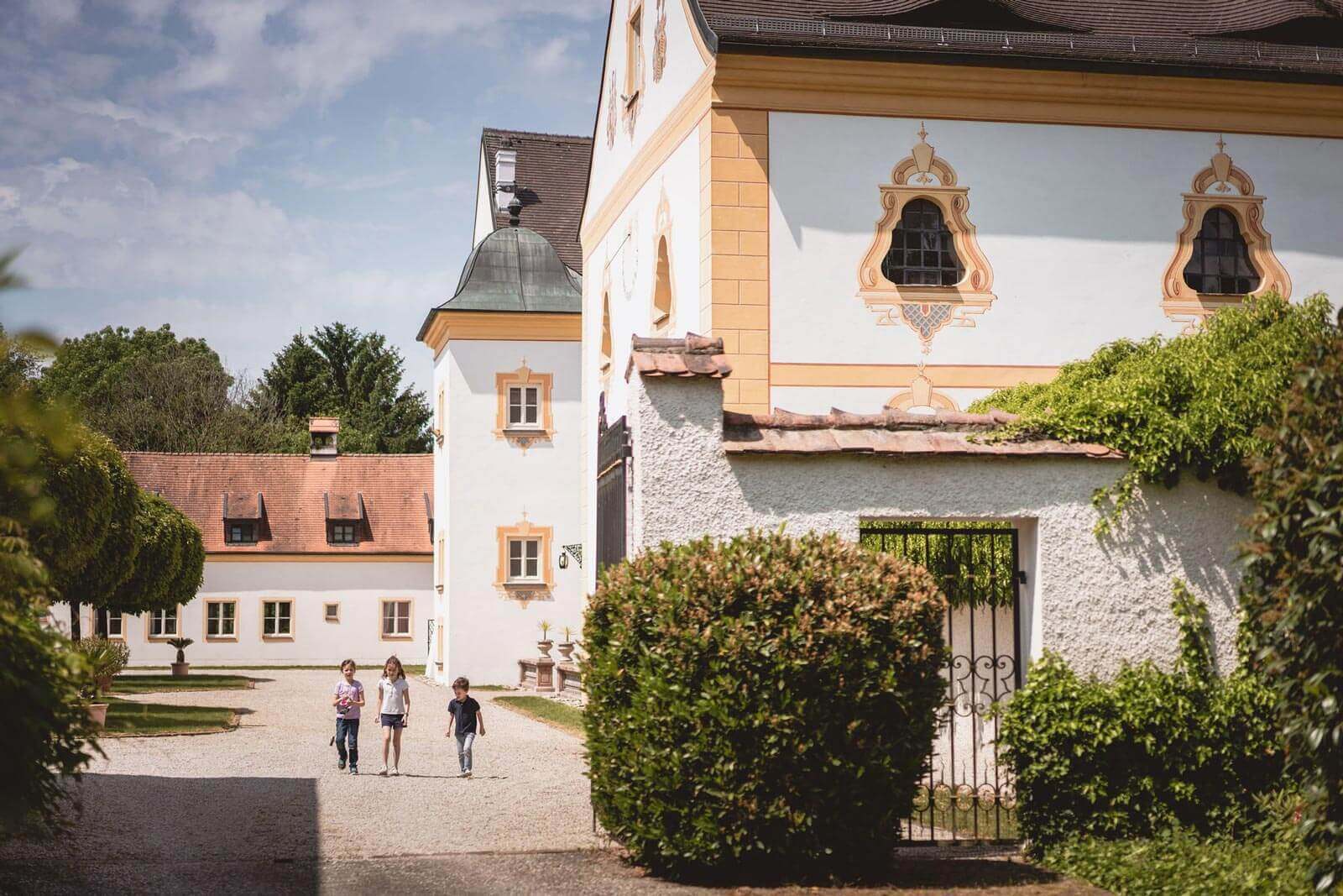 Der barocke Edelsitz aus dem Ende des 17. Jahrhunderts ist ein dreiflügeliger, zweigeschossiger Bau mit zwei über Eck gestellten Türmen an der Nordseite mit flachen Kuppelhauben. Ein dritter, hofseitiger Turm, wurde im 20. Jh. ergänzt. Die Ostseite nimmt die Schlosskirche auf. Die Fassade zieren gemalte Simsbänder und Fensterrahmungen mit Spätrokoko- und Zopfmotiven. Der ca. 4 Hektar große Park zieht sich stark abfallend bis nach Postmünster hinunter und bietet so eine prachtvolle Aussicht über das Rottal.